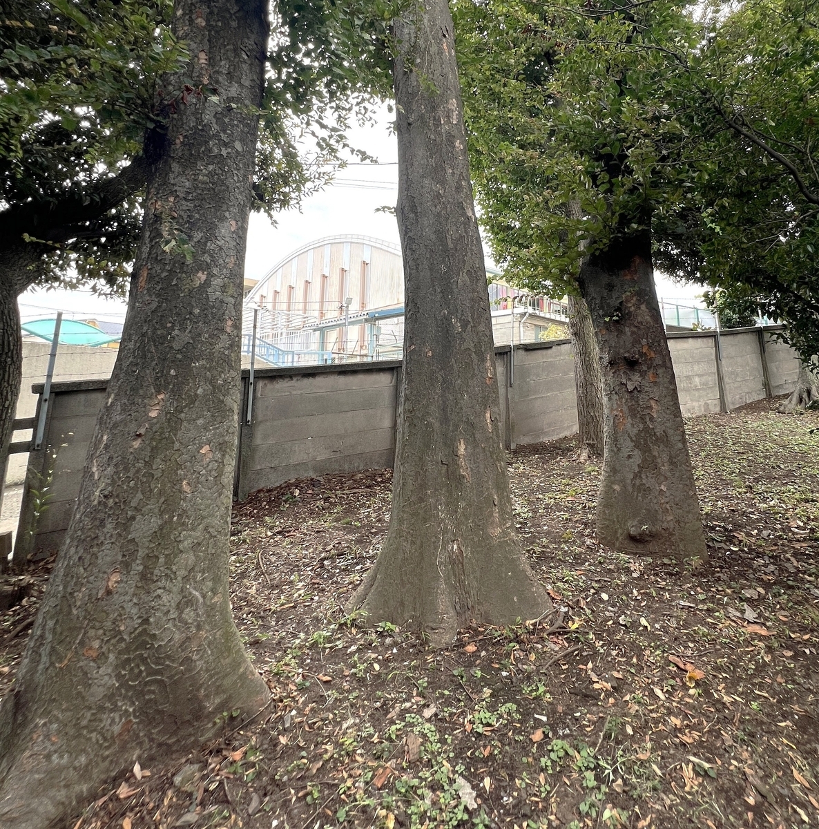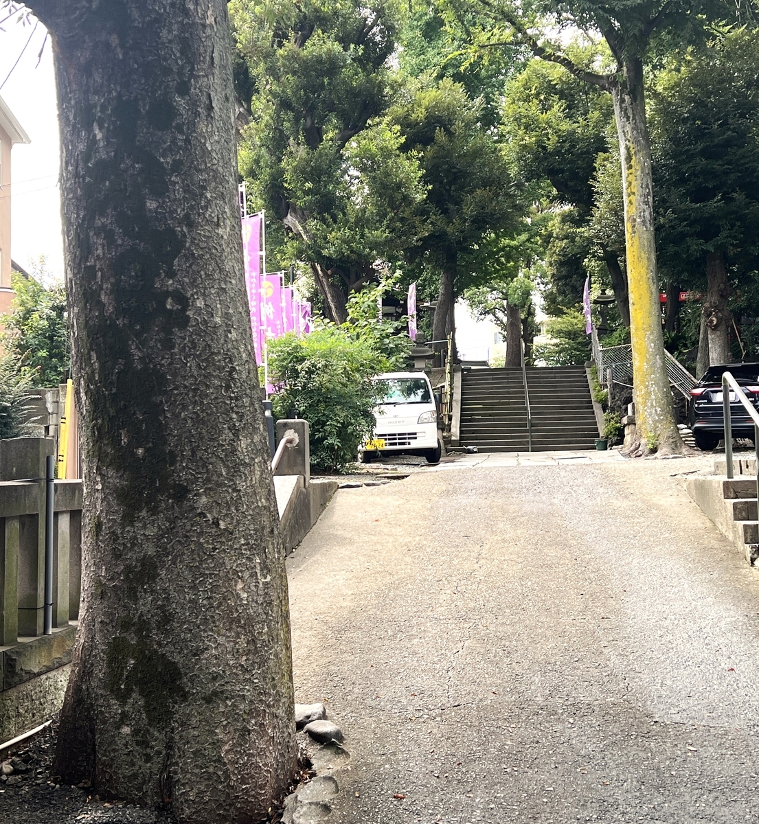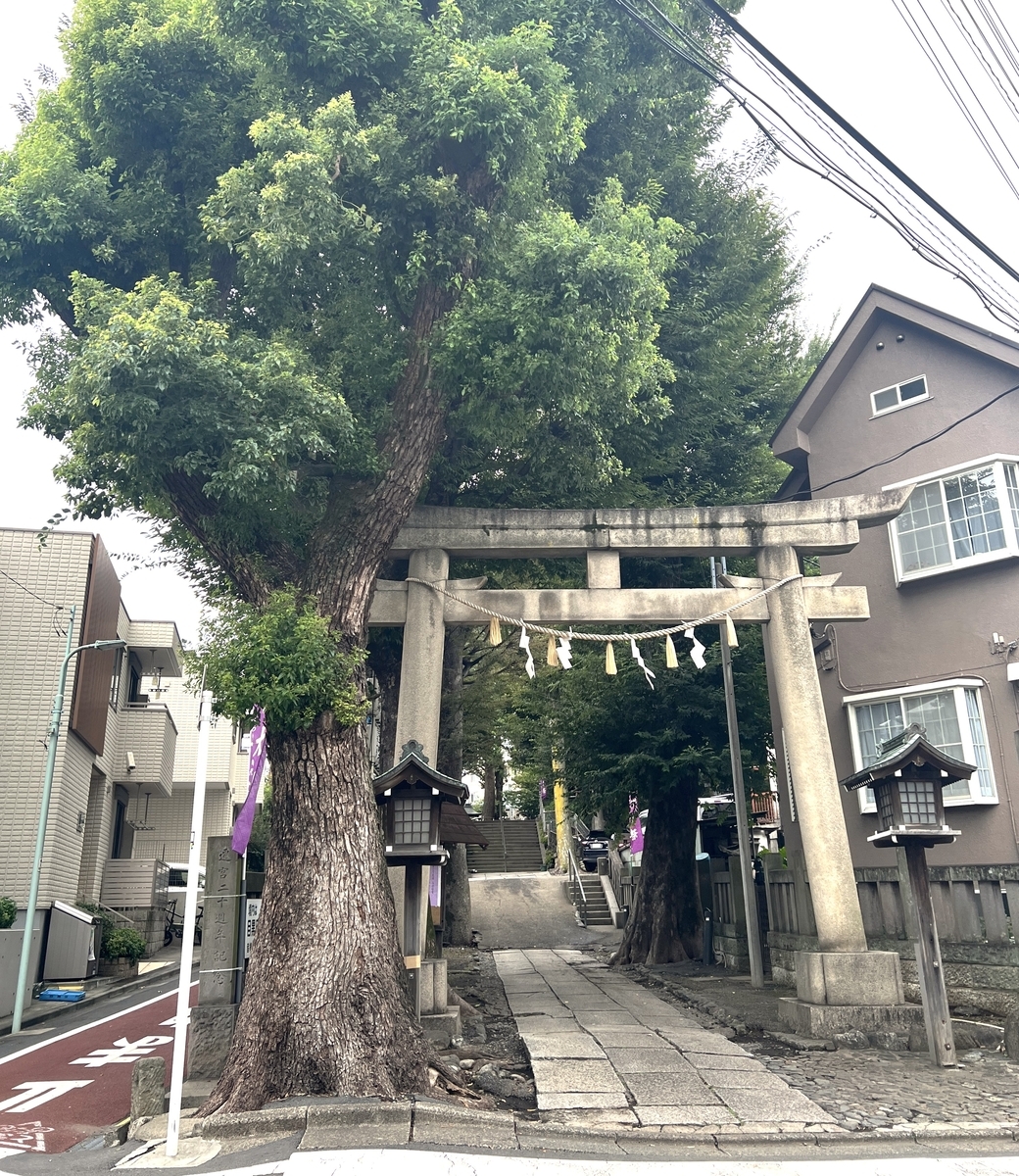中目黒八幡神社の入口です。左側のクスノキの大木が、圧倒的な存在感です。