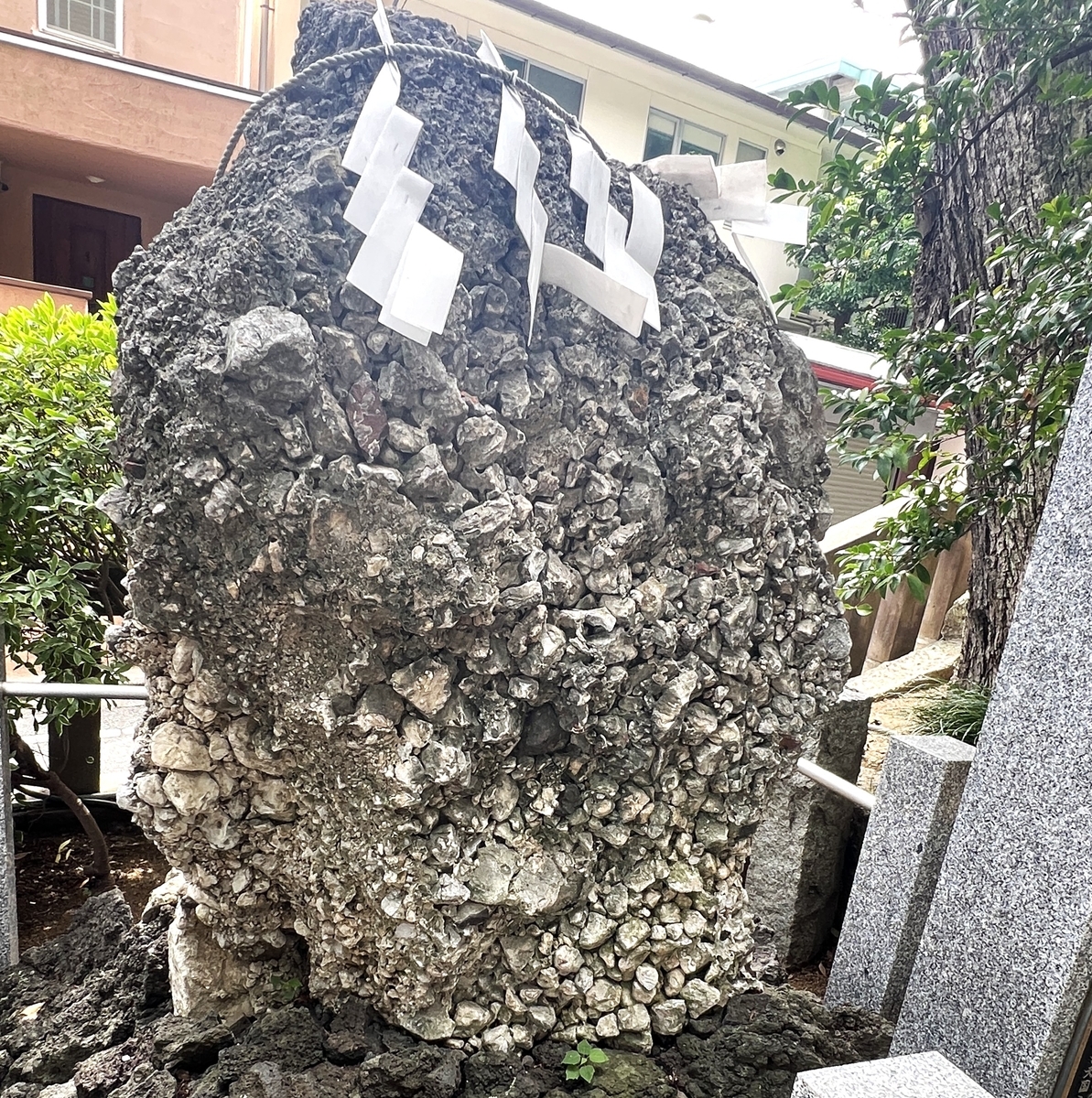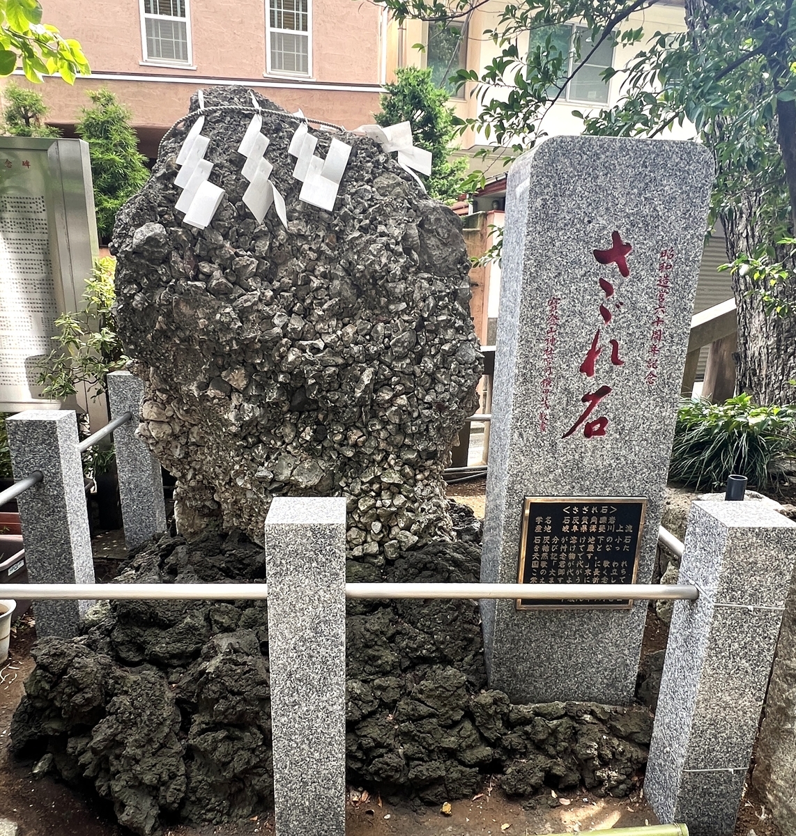 石段前の左側に「さざれ石」があります。石灰分が溶け地下の小石を結び付けて巌となった天然記念物です。国歌「君が代」の歌詞に使われ、その名が知られています。