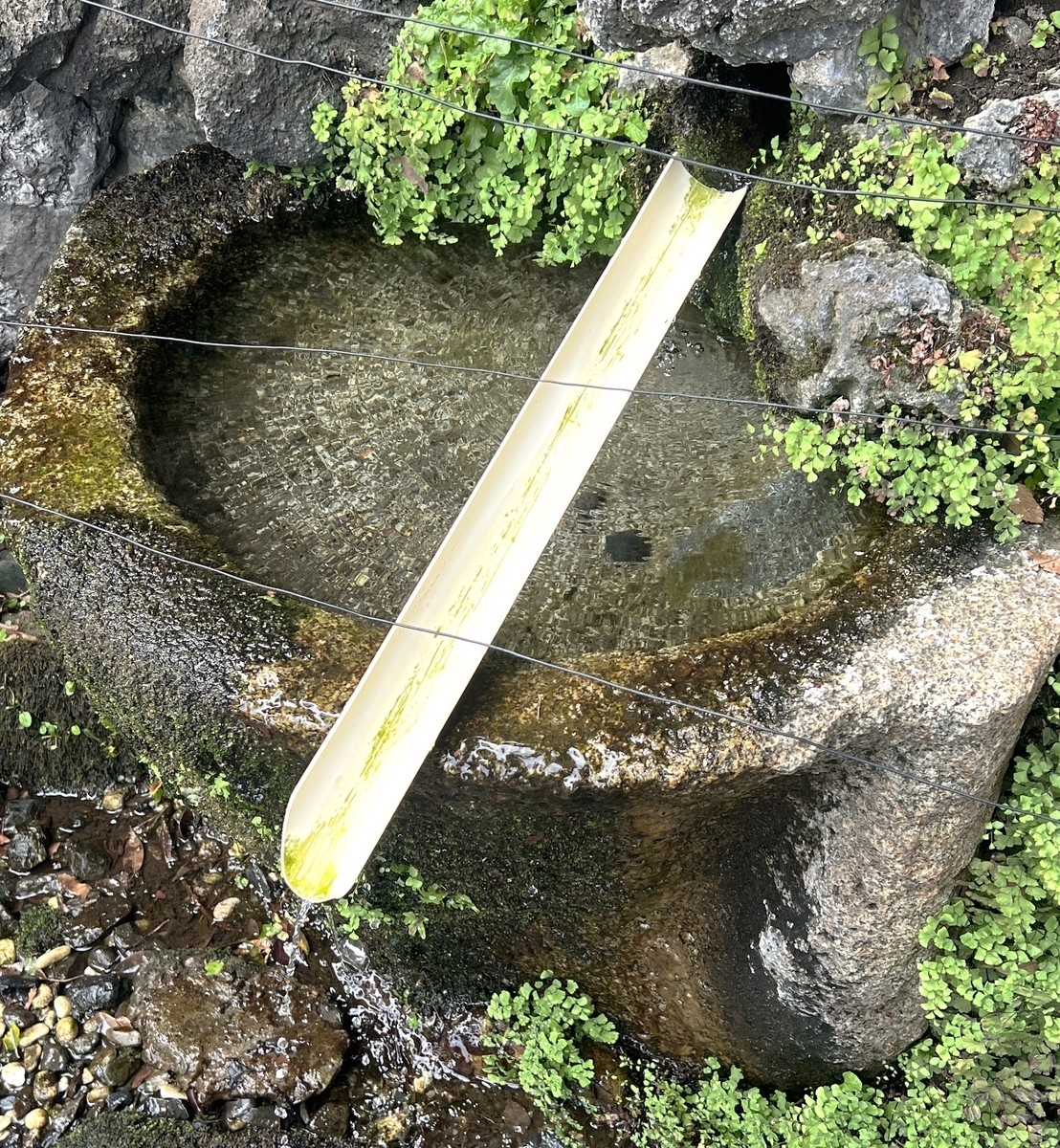 右手には湧き水の神泉があり、手水鉢で身を清めます。