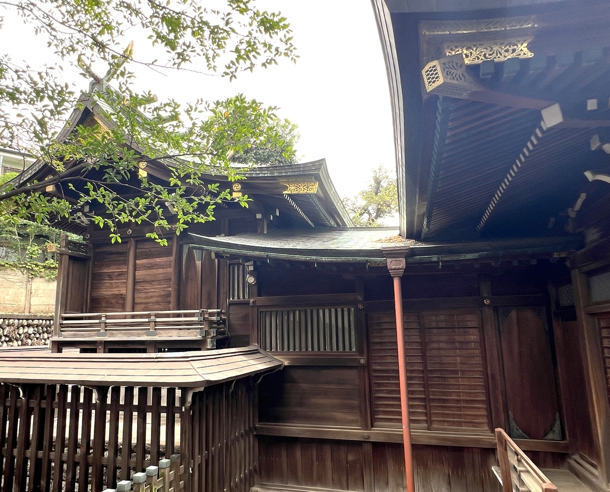 都心でありながら、境内は意外に広く湧水も豊富のようです。社殿へ行く前から湧水の神泉、さざれ石、ケヤキ、クスノキの大木と見所が満載でした。社殿は、本殿、弊殿、拝殿で構成された権現造りの神社建築様式です。周囲にクスノキの御神木などが守っているかのように緑と調和した社殿で心地よい感じでした。境内社に三峯神社があり、八幡信仰と三峰信仰にも関係が深いようです。