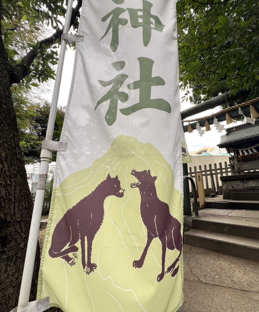 その左側に三峰神社があり少し登ります。奥秩父の「三峯神社」から勧請されたようで、幟にオオカミ信仰の絵が描かれています。