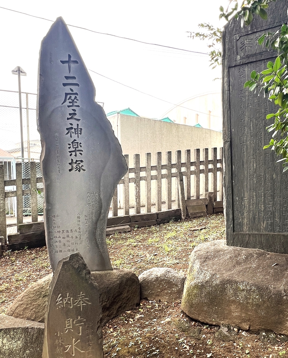 左奥には「十二座之神楽塚」と刻まれた石碑などがあります。