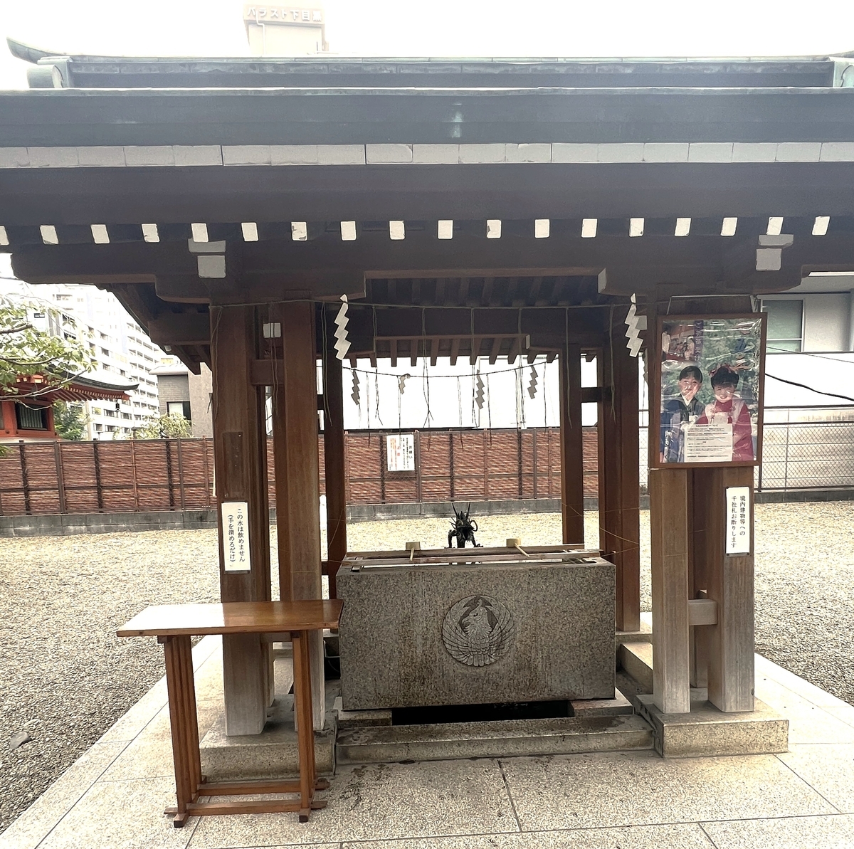 左手に手水舎です。手水鉢には鳳凰の社紋。